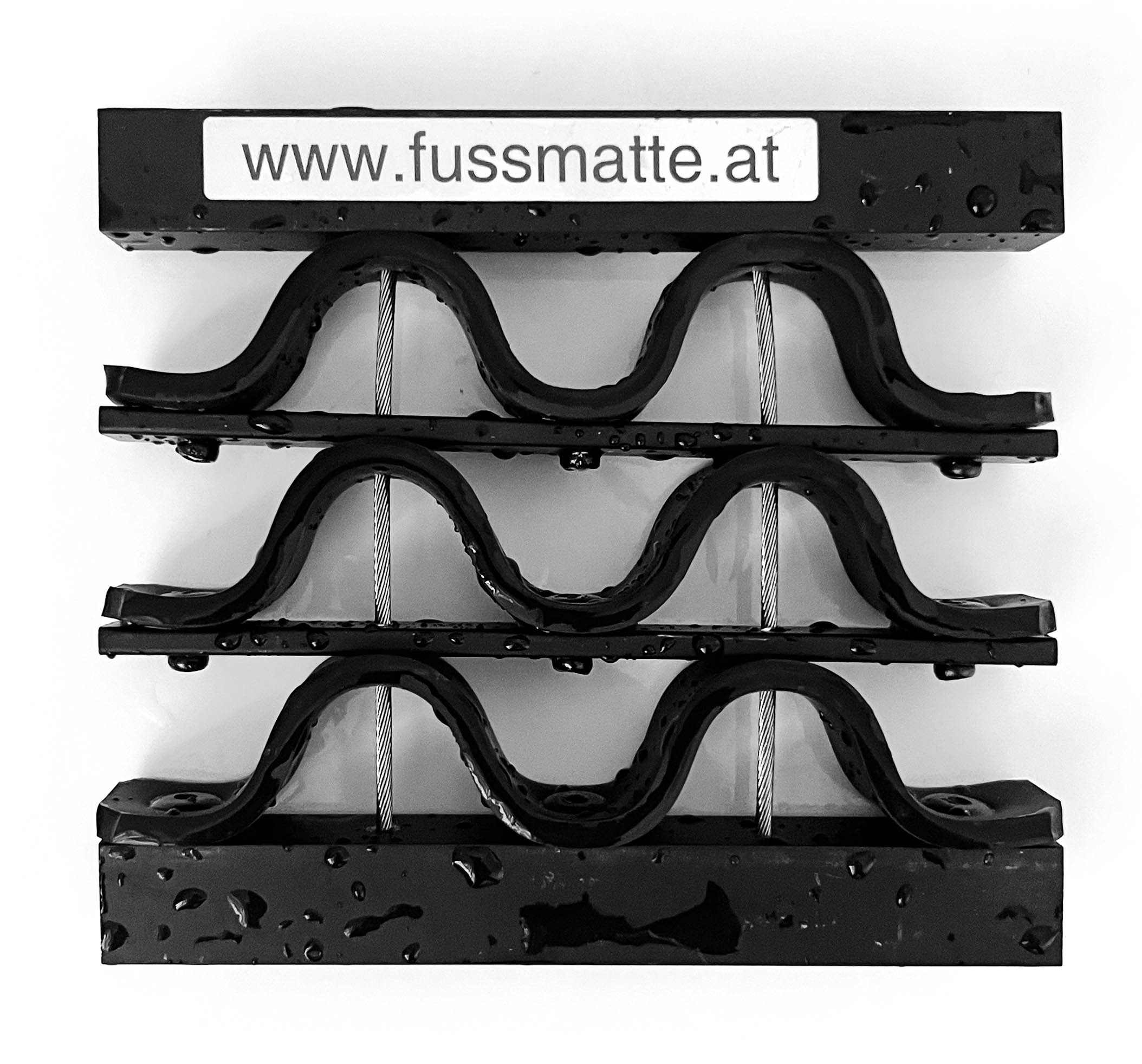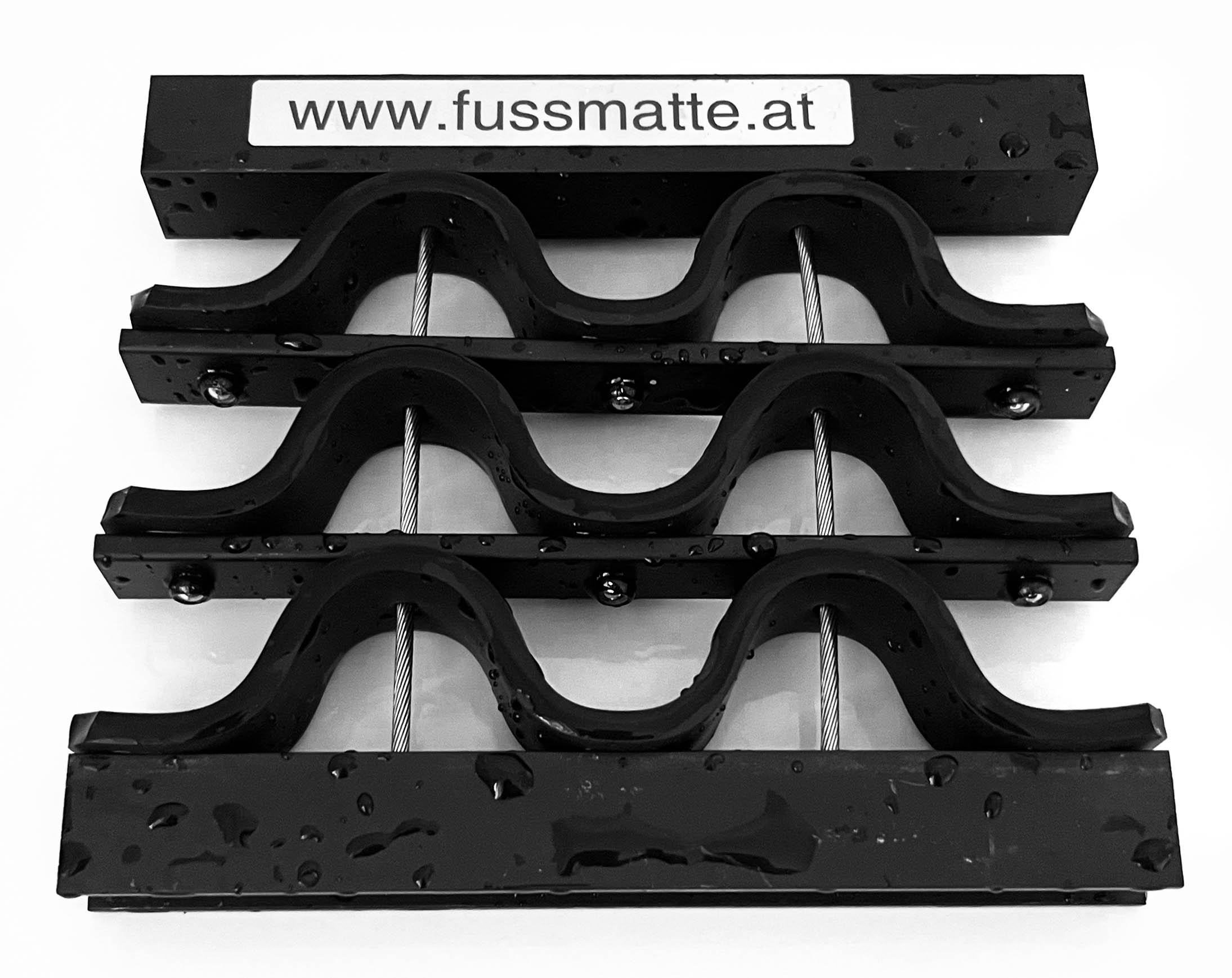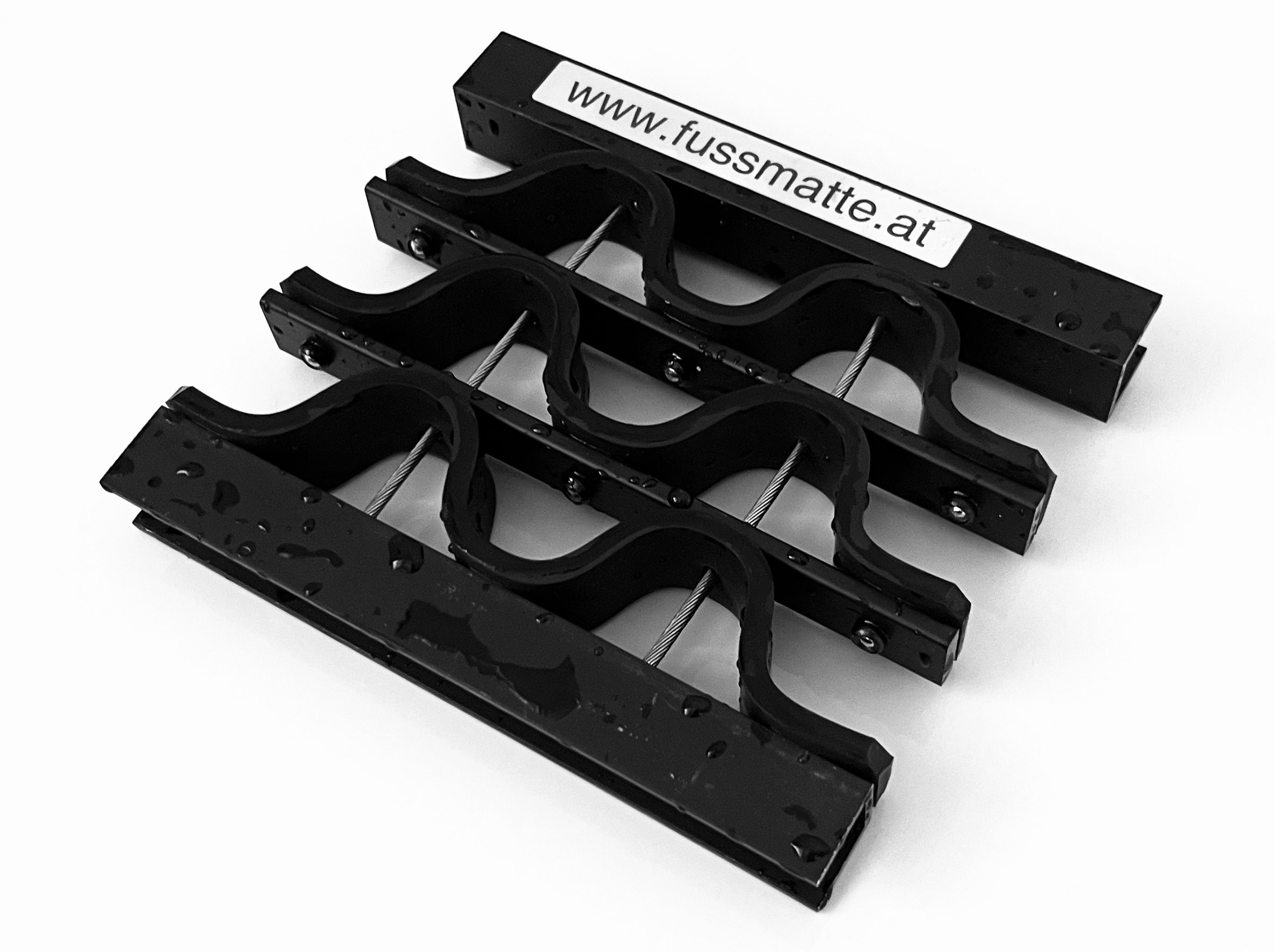 Die Fußmatte liegt vollflächig am Boden auf. Die Aluprofile der Fußmatte und die widerstandsfähigen, Gummi-Lamellen aus Synthetik-Kautschuk werden in Handarbeit mit Edelstahlseile miteinander verbunden. Der Schmutz / Matsch oder Schnee wird vom Schuh im Darübergehen abgestreift und bleibt nicht an der Oberfläche haften, wo der nächste Besucher ihn wieder aufnimmt und ins Haus trägt.