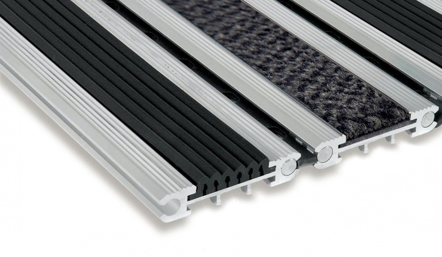 Die Fußmatte ist zusammenrollbar. Die Alu-Profile werden entweder mit Hilfe eines Gummi-Streifens in der Form eines Sägezahns für grobe Verschmutzungen oder mit einer Textilen Oberfläche für feine Verschmutzungen und Wasser versehen